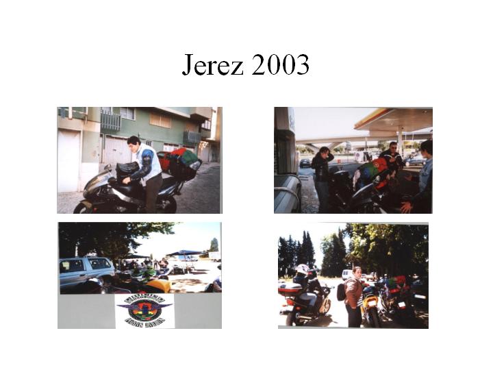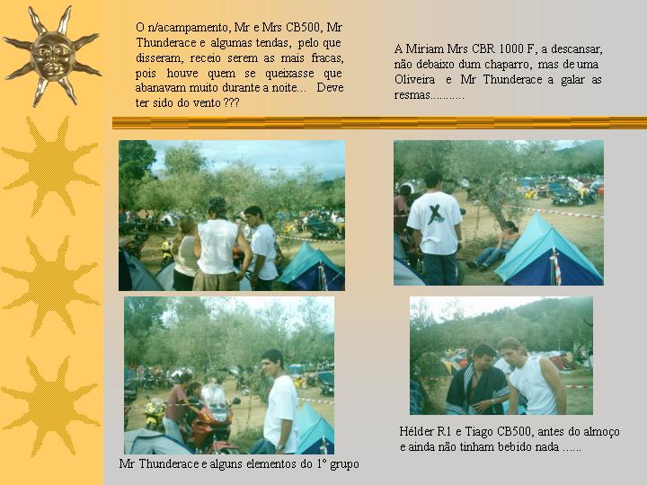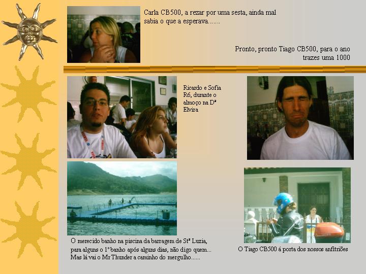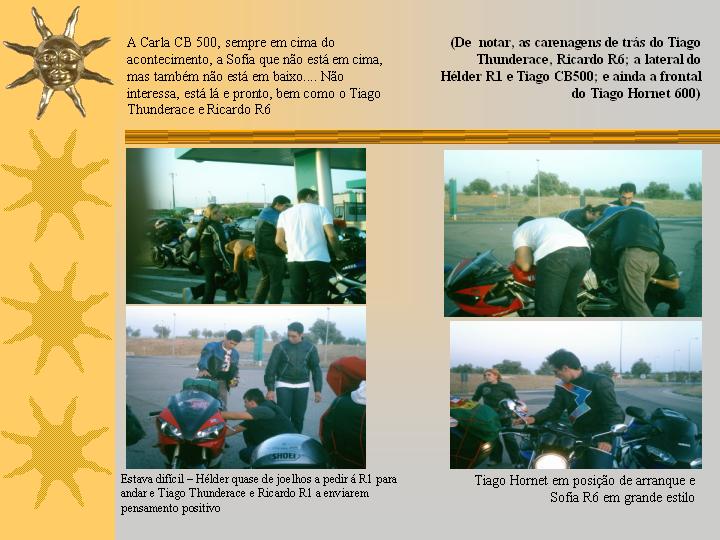 Ora ca estamos para comentar a celebre viagem a Gois 2003, que para alguns foi a 1 do ano e ate a 1 concentracao. O grupo da viagem (pois de acampamento era maior, foram 1 dia antes) foi: Tiago e Sonia em Yamaha YZF 1000 R Thunderace Helder em Yamaha R1 Ricardo e Sofia em Yamaha R6 Tiago em Honda Hornet 600 Tiago e Carla em Honda CB500 (Nao sei se repararam, mas os Tiagos estao a ganhar 3-0 e ainda vai na 1 parte e a nossa Sunshine foi de ferias para outras paragens) O encontro para a partida, estava marcado nas bombas da Shell, na rotunda do relogio, entre as 18.30 e as 19h. Thunderace e Hornet, foram buscar a Sofia ao Martim Muniz e seguiram para as bombas, pouco depois chegou a CB500 e como sempre ficamos a espera das noivas... R1 e R6. Finalmente, apos a chegada das nossas noivas, tudo atestadinho e ansioso por dar Gas.... Partimos. Mas foi sol de pouca dura ..... |