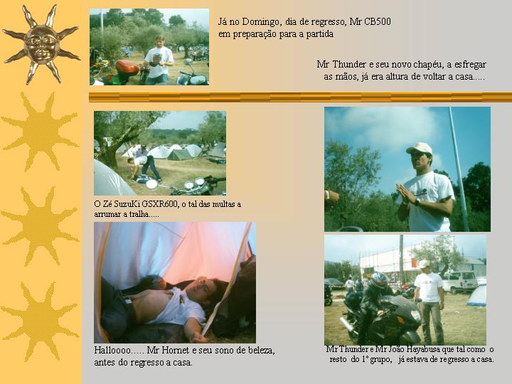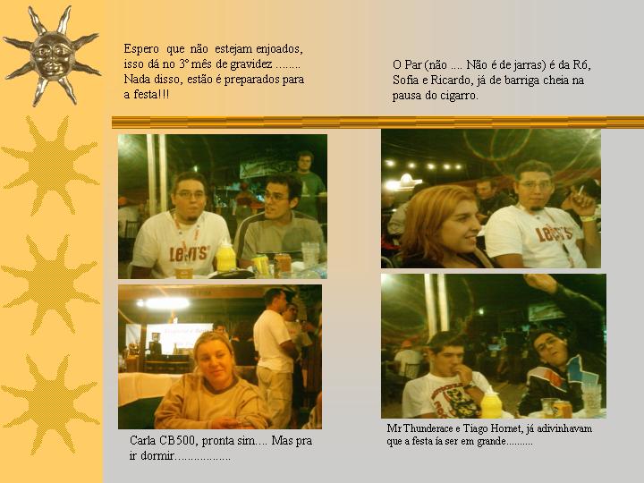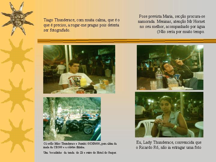 A fotoreportagem para nos acaba aqui, pois como fomos visitar alguns familiares do Mr Thunder, arrancamos primeiro que voces. Espero que tenham feito boa viagem e conto com a vossa colaboracao para terminar este caderno. Lembro que existem videos, sobre o almoco de Sabado, a viagem a Pampilhosa, a entrada na concentracao e algumas voltas pelo centro. Talvez seja mais facil, quando assinarem e efectuarem os v/comentarios, deixem os vossos mails afim de vos poder enviar todo o material. Gostava em especial, que os que foram pela 1 vez, opinassem sobre o que mais e menos gostaram, do que estavam a espera e nao aconteceu.... Ou seja tudo. Conto tambem, com a vossa colaboracao para escreverem sobre os episodios mais caricatos passados durante a diversao nocturna, aos quais nao assisti e e claro a vossa viagem de regresso. Quanto a nos ate a proxima ........................................... Shannuka Lady Thunderace Nota final desta edicao Apenas um, o Ze acabou por assinar, o resto deve ter ficado com medo que falsificasse assinaturas e lhes fosse as contas bancarias, fica para a proxima ehehehehe Mas o Ze ou melhor Jose Matos Suzuki GSXR600 contou: Sexta a noite, estava todo partido, queria descansar, mas o Helder nao tava a deixar, queria levar-me para a bebedeira, dei a desculpa que estava com frio e que tinha de ir a tenda para vestir o blusao, entrei na tenda e pimba.... Dormi que nem uma pedra ate ao dia seguinte. (Haviam de ver era o Helder e outro a espera dele na porta da tenda, eu vi, mas acho que o Ze, ja nao viu nada!) Foi um fim-de.semana em grande. Pro ano ha mais. (Obrigada Ze) |